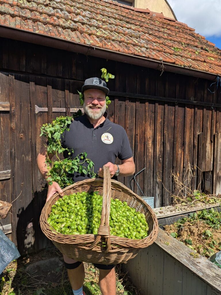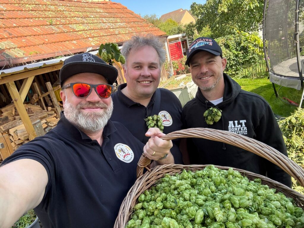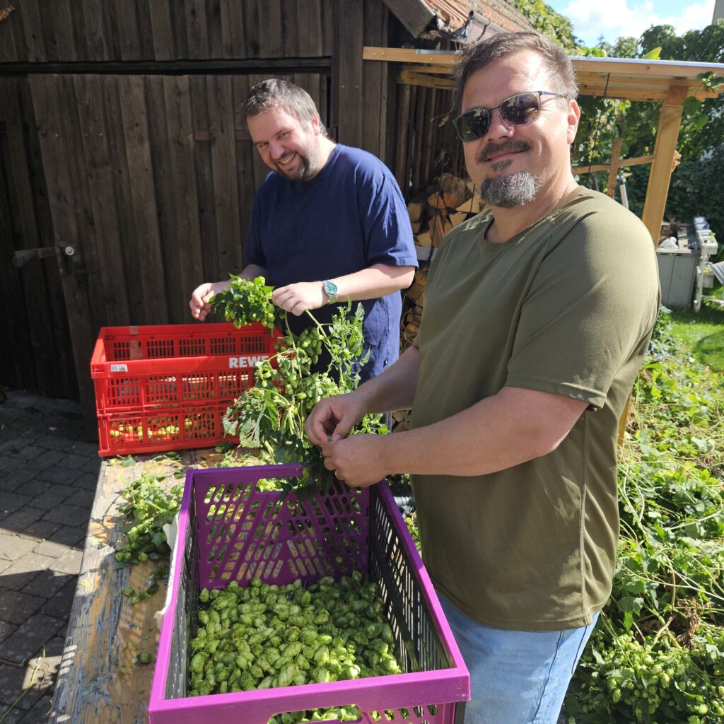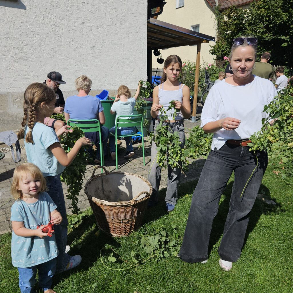Alle helfen mit! Wir haben wieder unsere Ernte eingebracht. Knapp 10 Kilo frischer Altdorfer Grünhopfen ist zusammengekommen. Mit einer kleinen Einkehr im Goldenen Anker ging es dann über den Marktplatz direkt zur Brauerei, wo wir ein Grünhopfenpils und ein Grünhopfen Pale Ale daraus gebraut haben. Das Pale Ale gibt es dann an unserem Braufest, das Pils gibt es etwas später – spätestens dann am Weihnachtsmarkt.